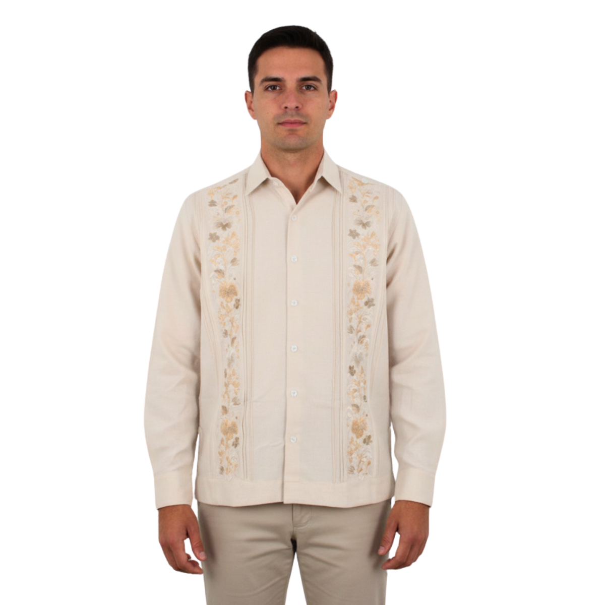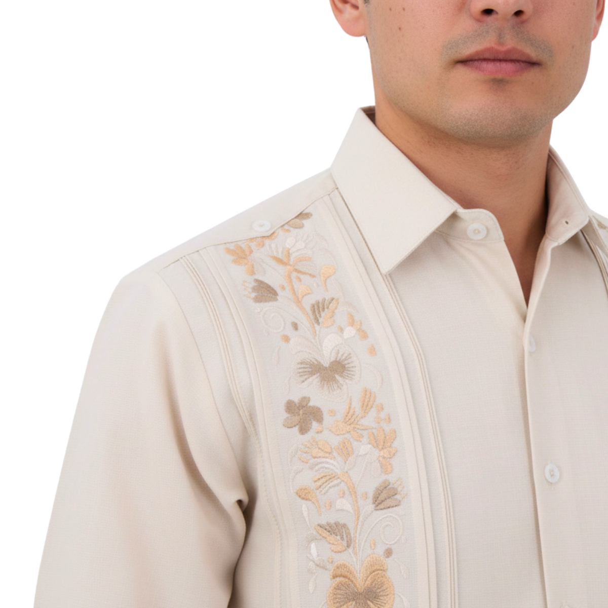 Guayabera Bordada Yucateca Beige Modelo Colibrí Manga Larga Para Hombre