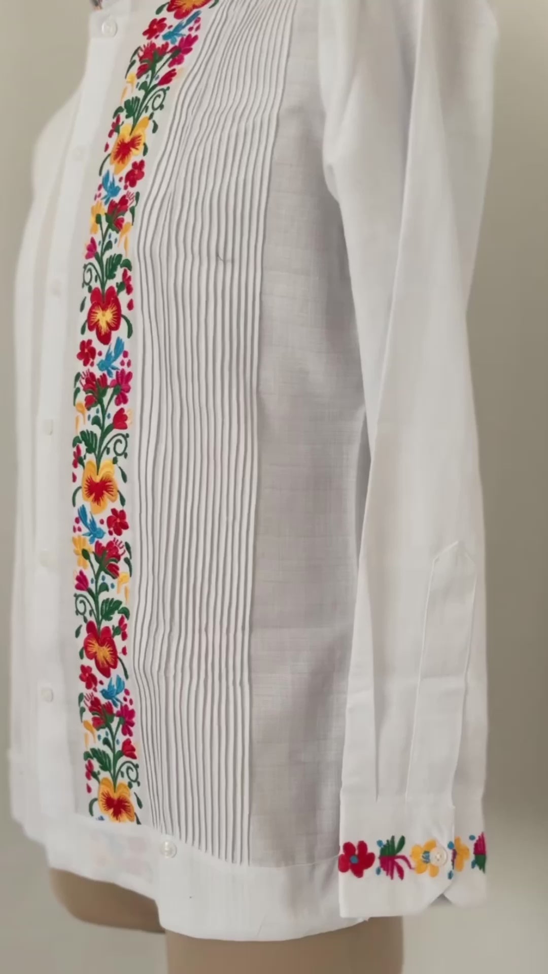 Guayabera elaborada artesanalmente en Tekit, Yucatán, con especial atención al detalle y a la calidad superior de sus telas y acabados. Presenta bordado a máquina y alforzas hechas a mano tanto al frente como en la parte posterior.